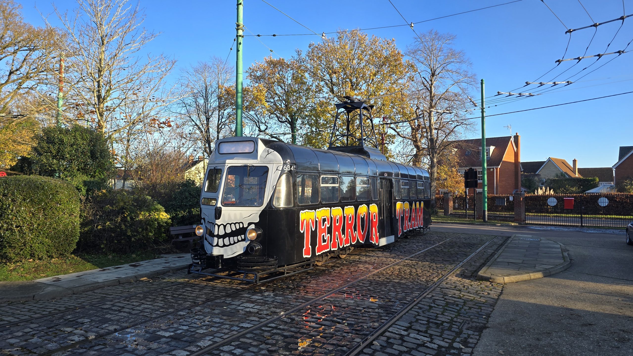 Tram 634, originally built as car 297 in 1937 as one of twenty Brush Railcoaches for Blackpool Corporation, served for decades before being stored in 1974 and returning in 1976 with modern updates and a blue and yellow livery celebrating Blackpool’s centenary. It later carried various advertising liveries, gained a pantograph in 1986, and was rebuilt after a 1987 collision with upgraded glazing and fittings. Returning to service in 1988 in green and cream, it continued operating through the 1990s, including the notable black “Terror Train” livery promoting Coral Island in 1996, before withdrawal in 2004. Purchased by Andy Ashton in 2009, it was restored at the Rushden Transport Museum with traditional interior materials and repainted in its 1990s-style livery. Donated to the Blackpool Heritage Trust in 2016 and later transferred to the Fylde Transport Trust, 634 now lives and runs frequently at the East Anglia Transport Museum, on loan . The tram has become a staple for visitors and makes a great addition to the site during Halloween events